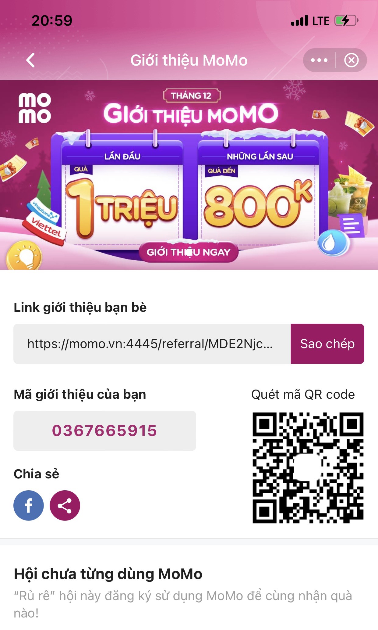 Bạn login vào app và chọn mục Ví của tôi > Giới thiệu MoMo > lấy link và mã giới giới share cho bạn bè.