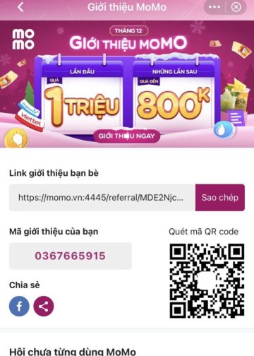 Bạn login vào app và chọn mục Ví của tôi > Giới thiệu MoMo > lấy link và mã giới giới share cho bạn bè.