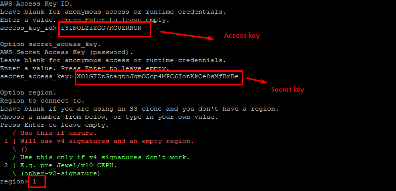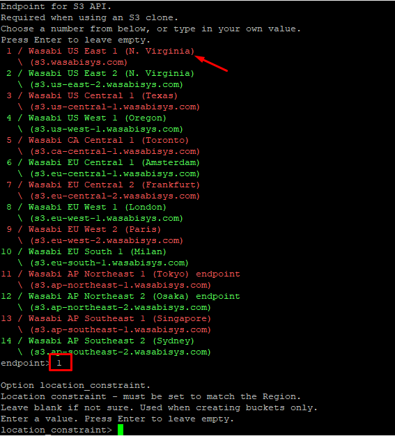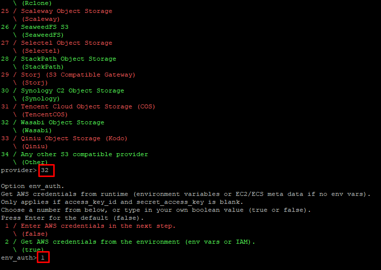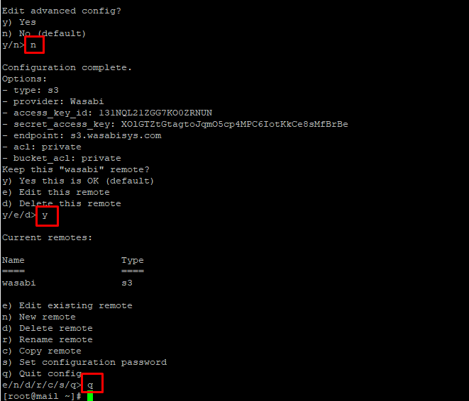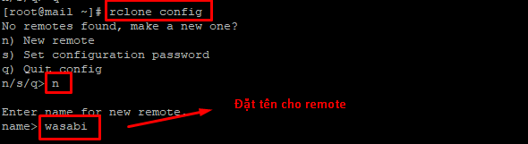 Ta dùng lệnh rclone config để tạo 1 new remote. Ở đây ta ví dụ kết nối với S3 của Wasabi.