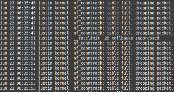 Jul  1 14:54:09 sv195141 kernel: nf_conntrack: table full, dropping packet.