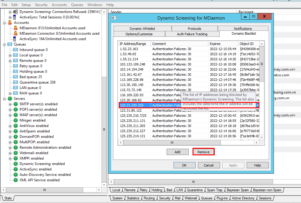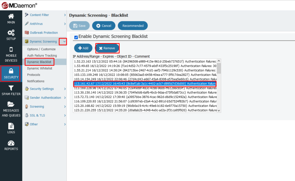 Chọn tab Dynamic Blacklist > Chọn IP cần xóa > Remove