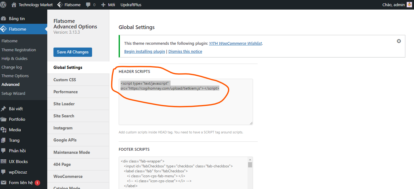 Bước tiếp theo là bạn vào trang quản trị chọn Flatsome –> Advanced –> Global Setting