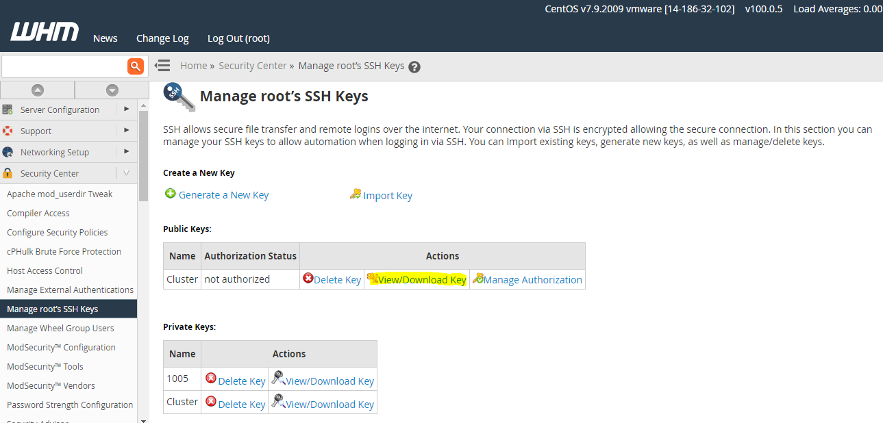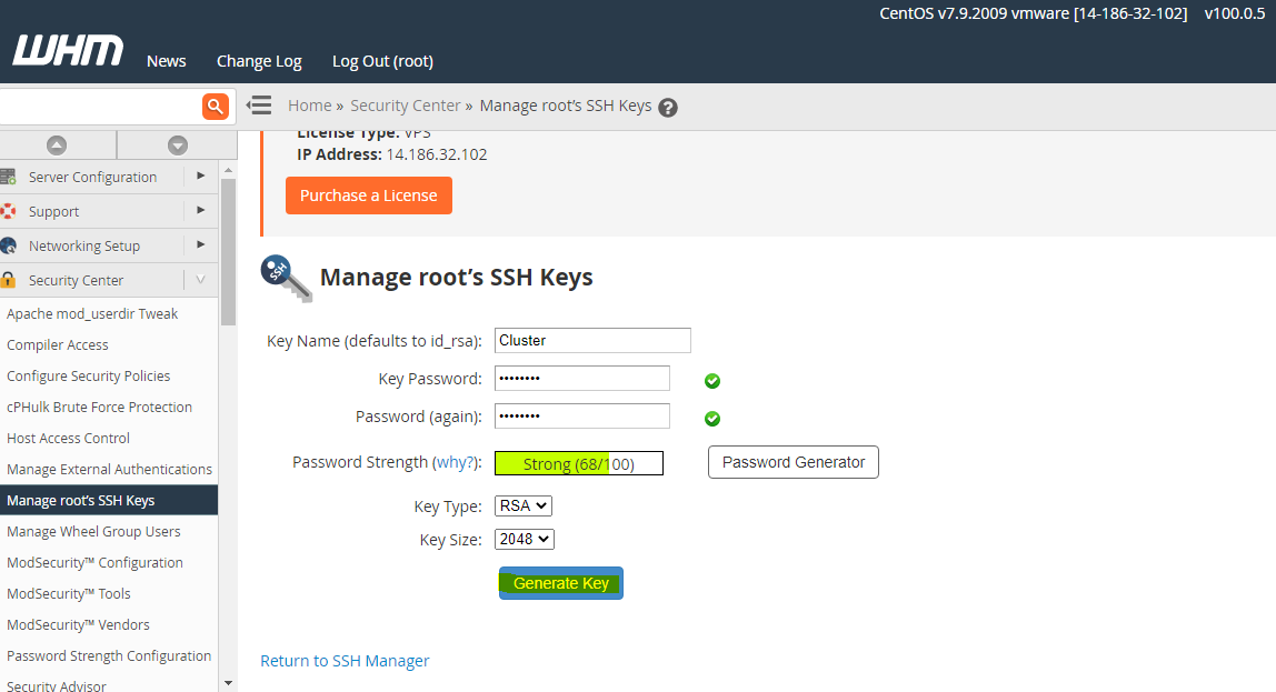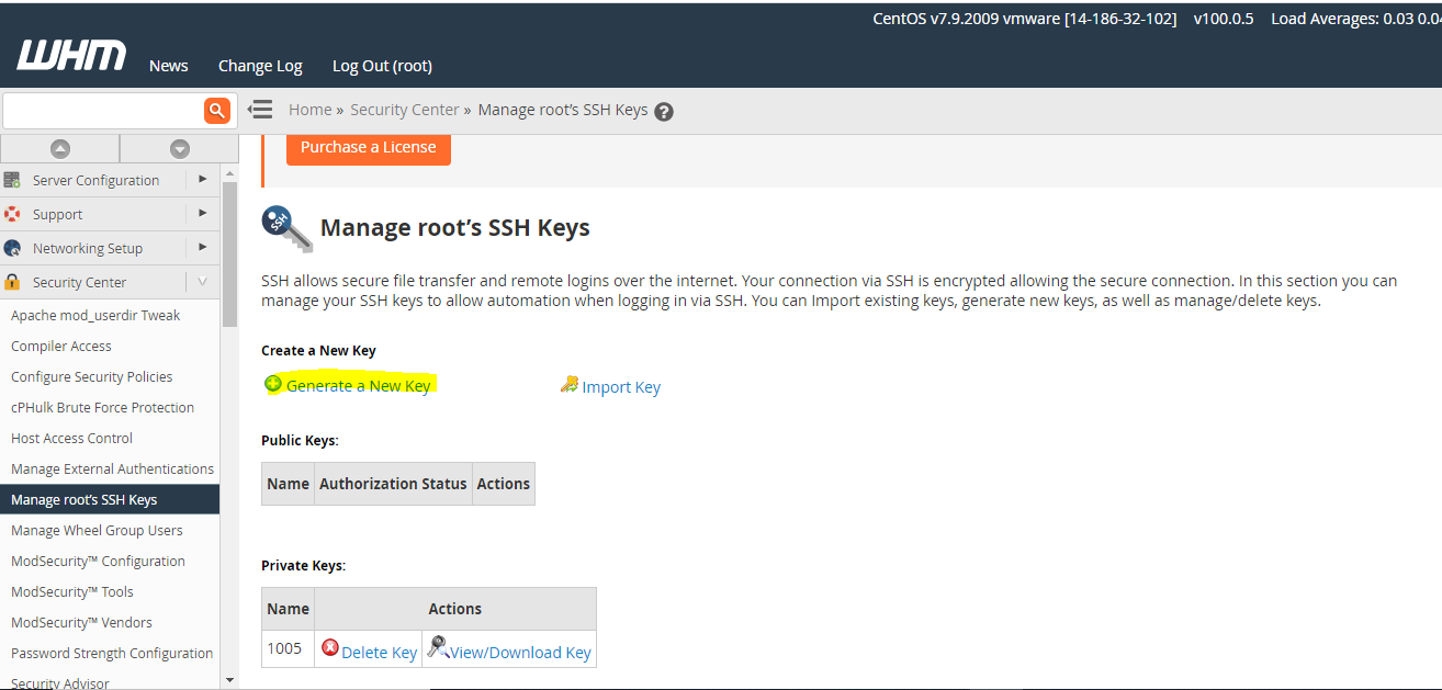 Vào Home >> Security Center >> Manage root’s SSH Keys >> Generate a New Key