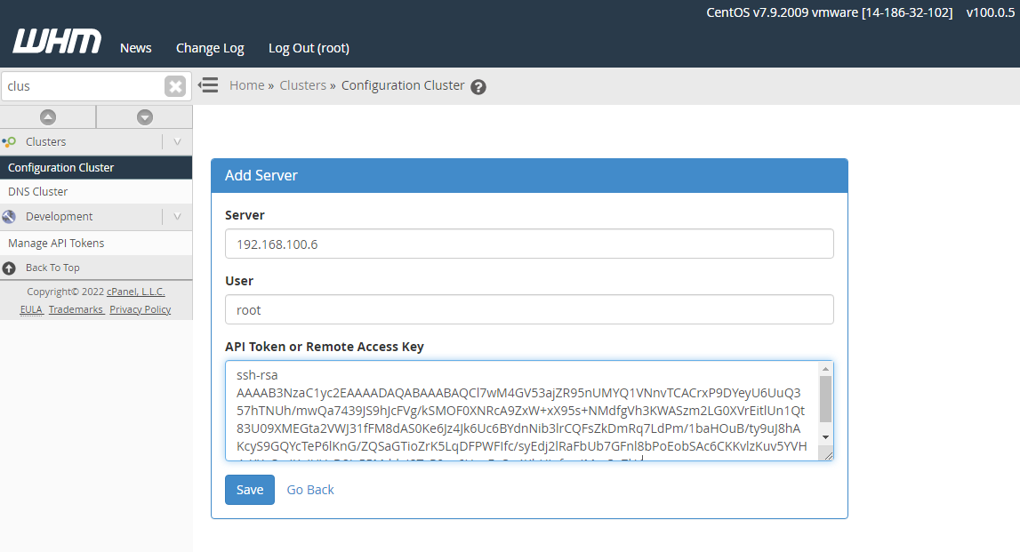 Nhập vào IP và Remote Access key của WHM2 >> Save